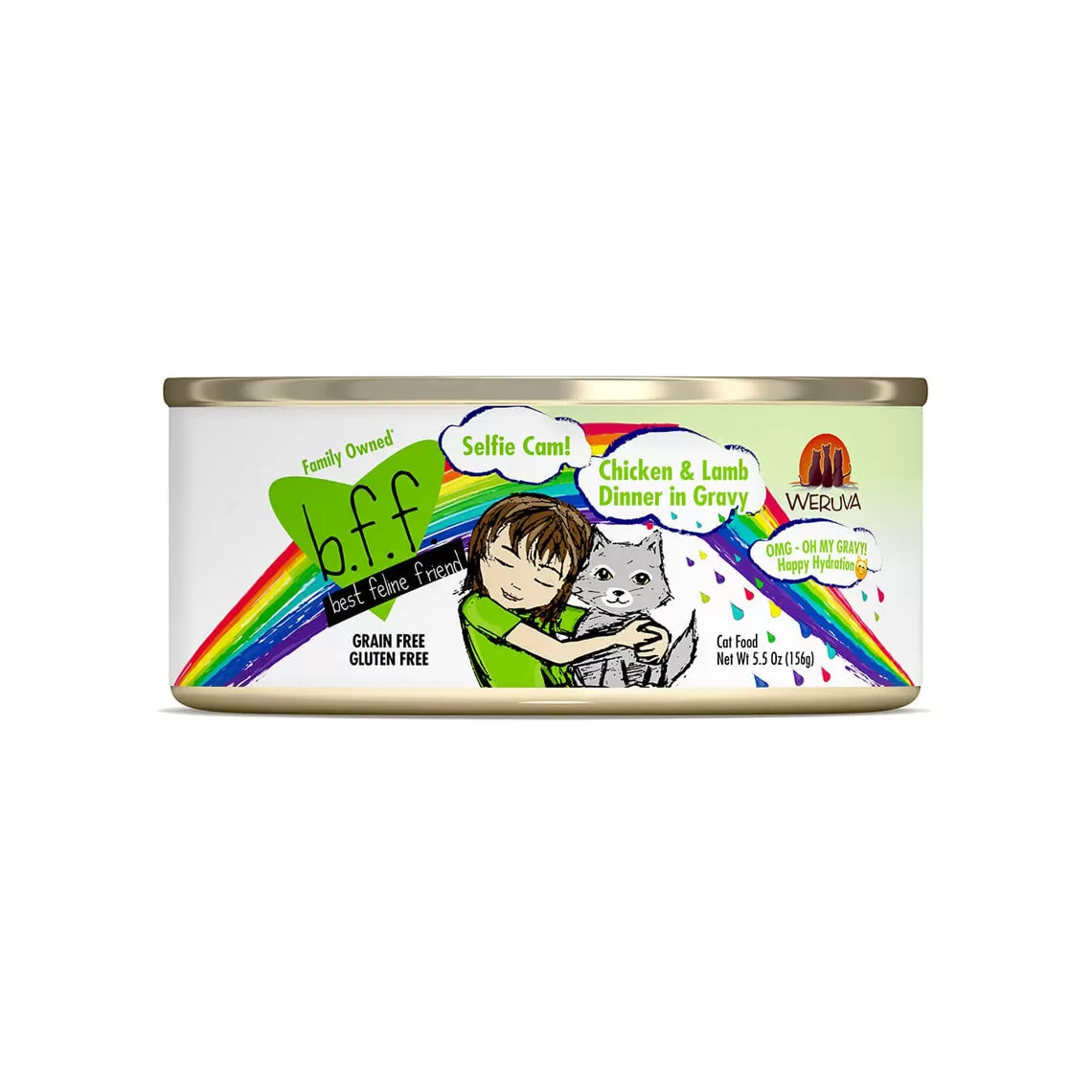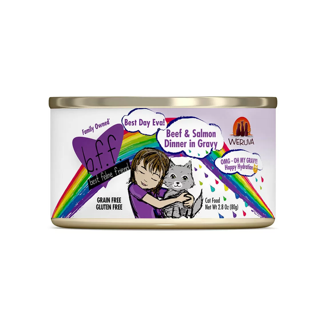 Each can of BFF gravy cat food contains different flavors and protein mixes, from chicken and turkey, chicken and salmon, chicken and lamb, duck and tuna, to beef and salmon. All flavors topped with delicious gravy to create the best wet cat food with gravy for your favorite feline. Available in a 2.8 oz or 5.5oz can, in singles or in cases.