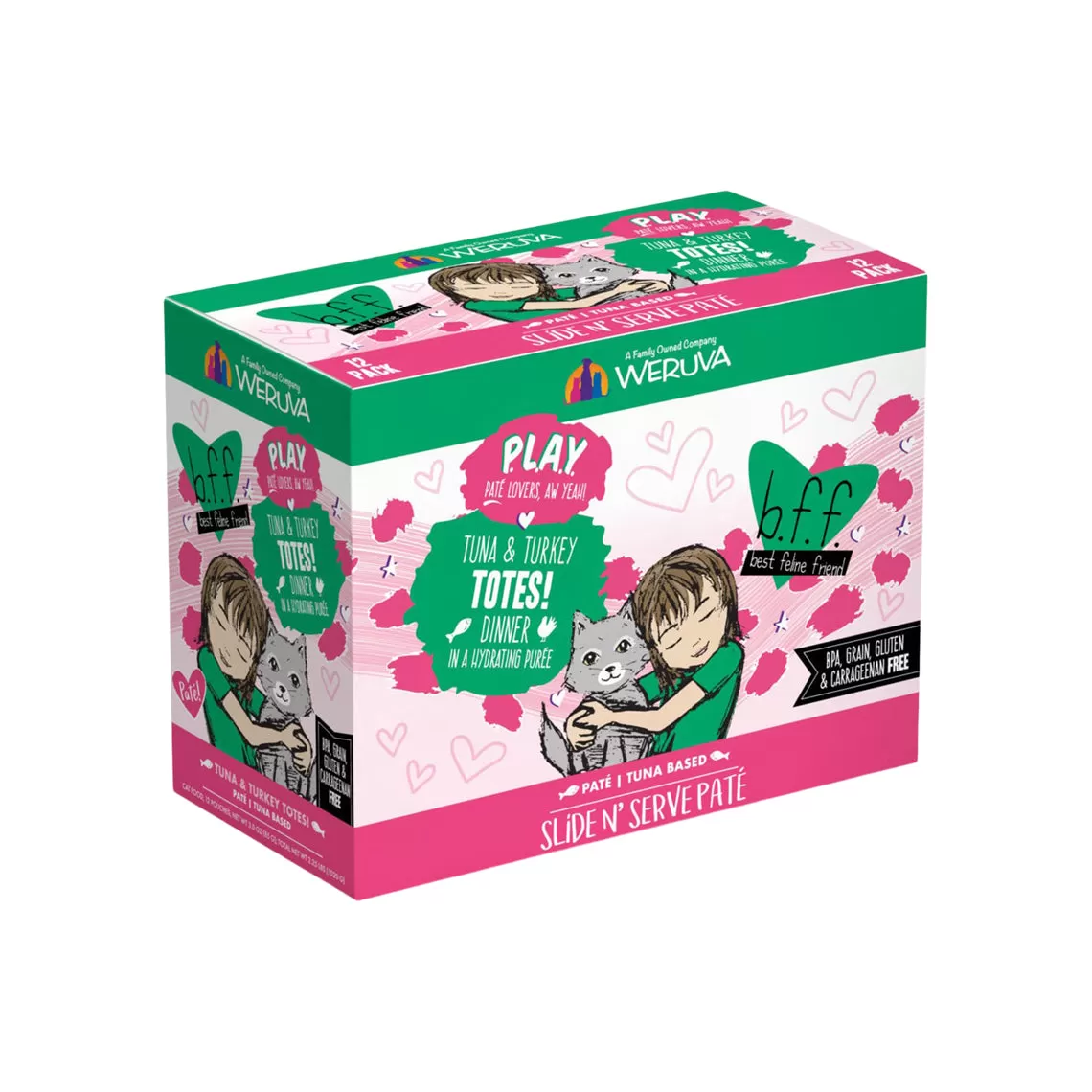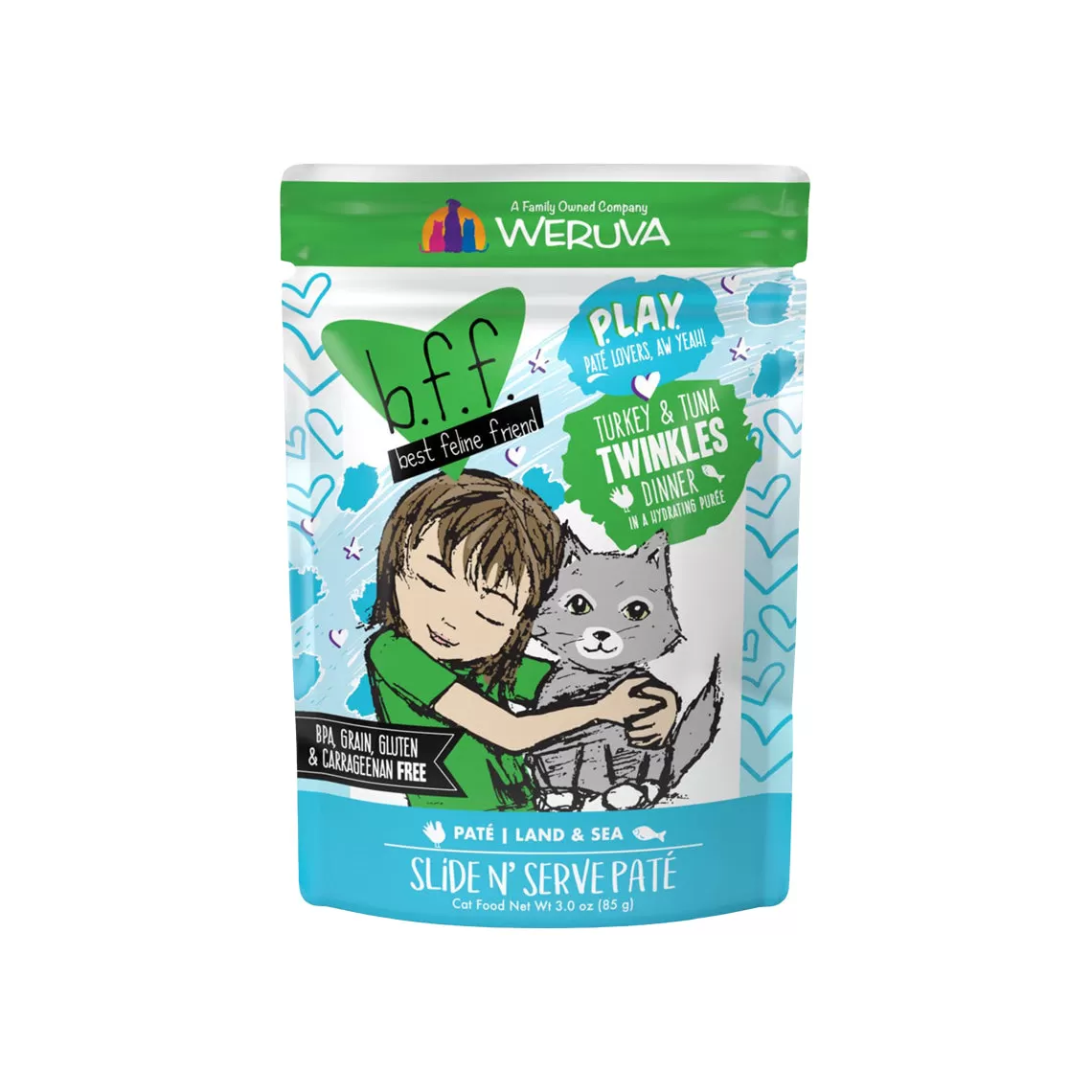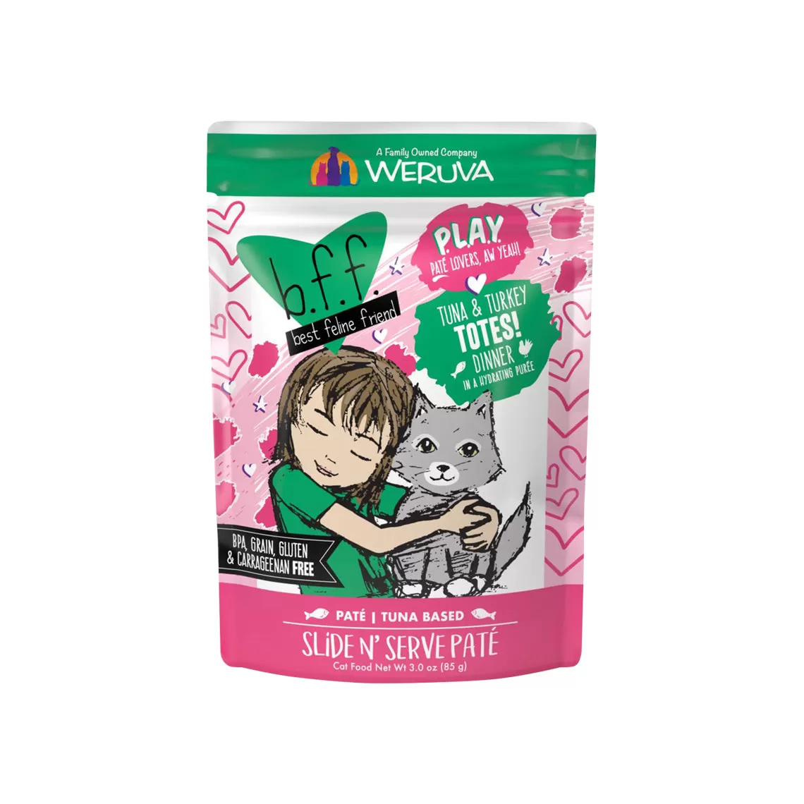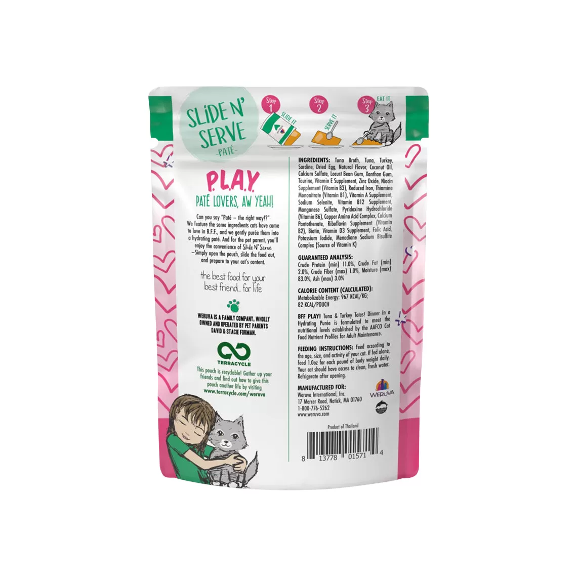 Highly palatable for picky kitties. Serving is a cinch and mess-free, PLAY! Pate Lovers simply slides out of the recyclable pouch! BFF knows what’s left out is just as important as what’s in the recipe, so there are no grains, gluten, carrageenan, MSG, artificial flavors, artificial colors or BPA. Give your cats a healthy meal with real ingredients and variety!