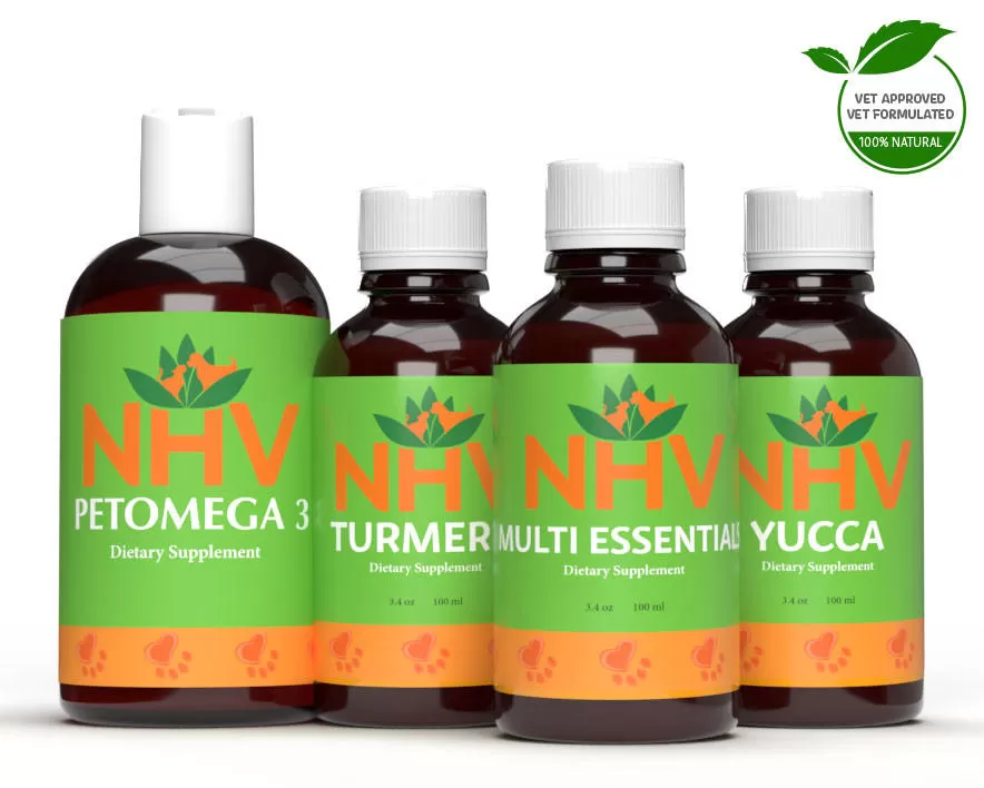 Like humans, vitamins and minerals in our furbaby’s body work together synergistically rather than function as isolated chemicals. When we single out a vitamin, we may lose the balance that nature provides with interdependent co-factors (helper molecules) like trace minerals or phytochemicals. The best way for your pet to get the vitamins and minerals they need is to get them from whole plant sources rather than made synthetically in a lab. Our Daily Pet Supplement Bundle contains NHV Multi-Essentials, NHV Turmeric, NHV Petomega 3 and NHV Yucca. All of our supplements are full-spectrum and made from the finest quality herbs. Each blend is specifically formulated for pets. Full-spectrum means that all of the vitamins, minerals and trace elements are kept intact during the extraction process to make it bioavailable as daily dog vitamins or natural cat vitamins for your furkiddo.