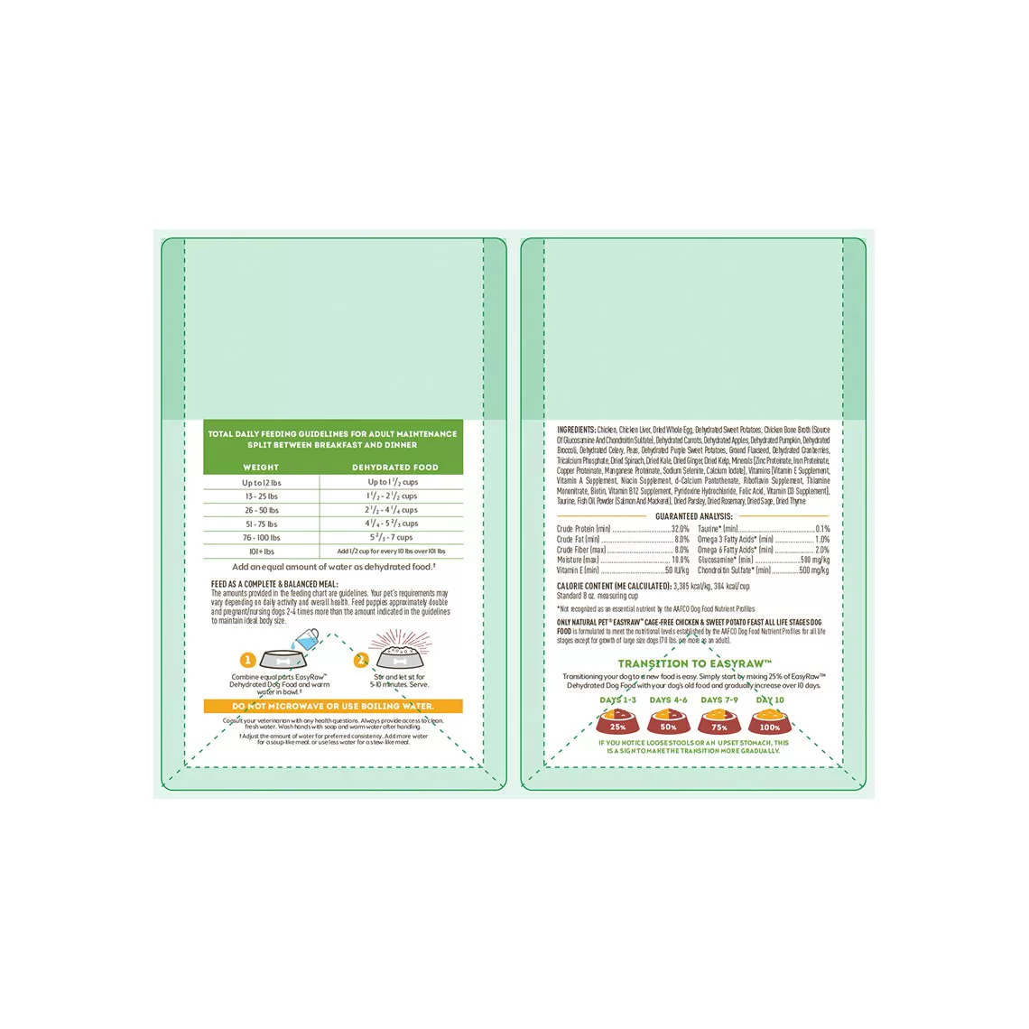 Only Natural Pet EasyRaw Cage-Free Chicken & Sweet Potato Feast Dehydrated Dog Food is made with freeze-dried, raw chicken and dehydrated vegetables and fruits. These minimally processed ingredients combine for maximum nutrition, freshly prepared meal that is complete and balanced for adult dogs.
