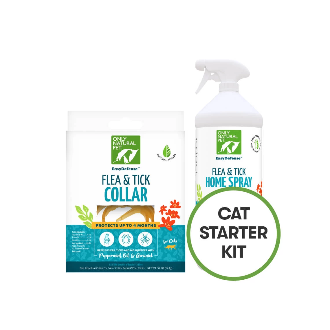 These Starter Kits for Cats are designed to REPEL fleas and ticks from your cat and DEFEND your home by creating a safe, pest-free zone. Choose either the Flea & Tick Collar or topical Flea & Tick Squeeze-On to naturally repel fleas & ticks from your cat combined with our Flea & Tick Home Spray to use on flooring, furniture and pet bedding. Only Natural Pet’s Home Spray is proven effective at killing fleas, ticks and mosquitos on contact and repelling pests for up to two weeks.
