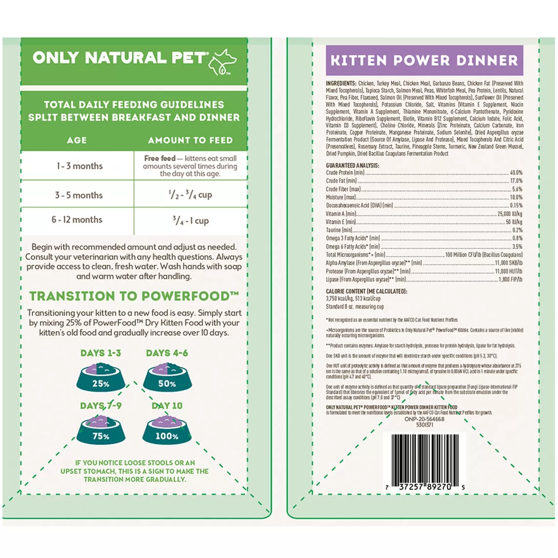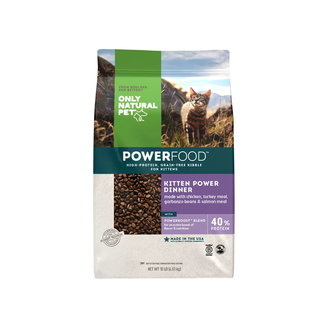Only Natural Pet PowerFood Kitten Power Dinner Kitten Food is a dry kitten food made with chicken, turkey meal, garbanzo beans, & salmon meal. These ingredients combine for a nutritious meal that features 40% protein and is complete and balanced for growth of all sizes of cats.
