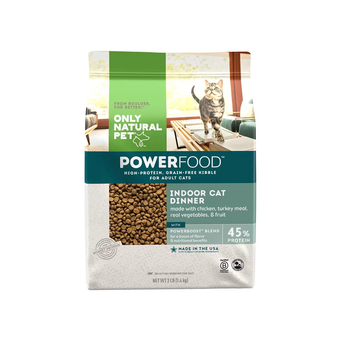 Only Natural Pet PowerFood Indoor Cat Dinner is a dry cat food made with chicken, turkey meal, real vegetables, and fruit. These ingredients combine for a nutritious meal that features 45% protein and is specially formulated for indoor cats.