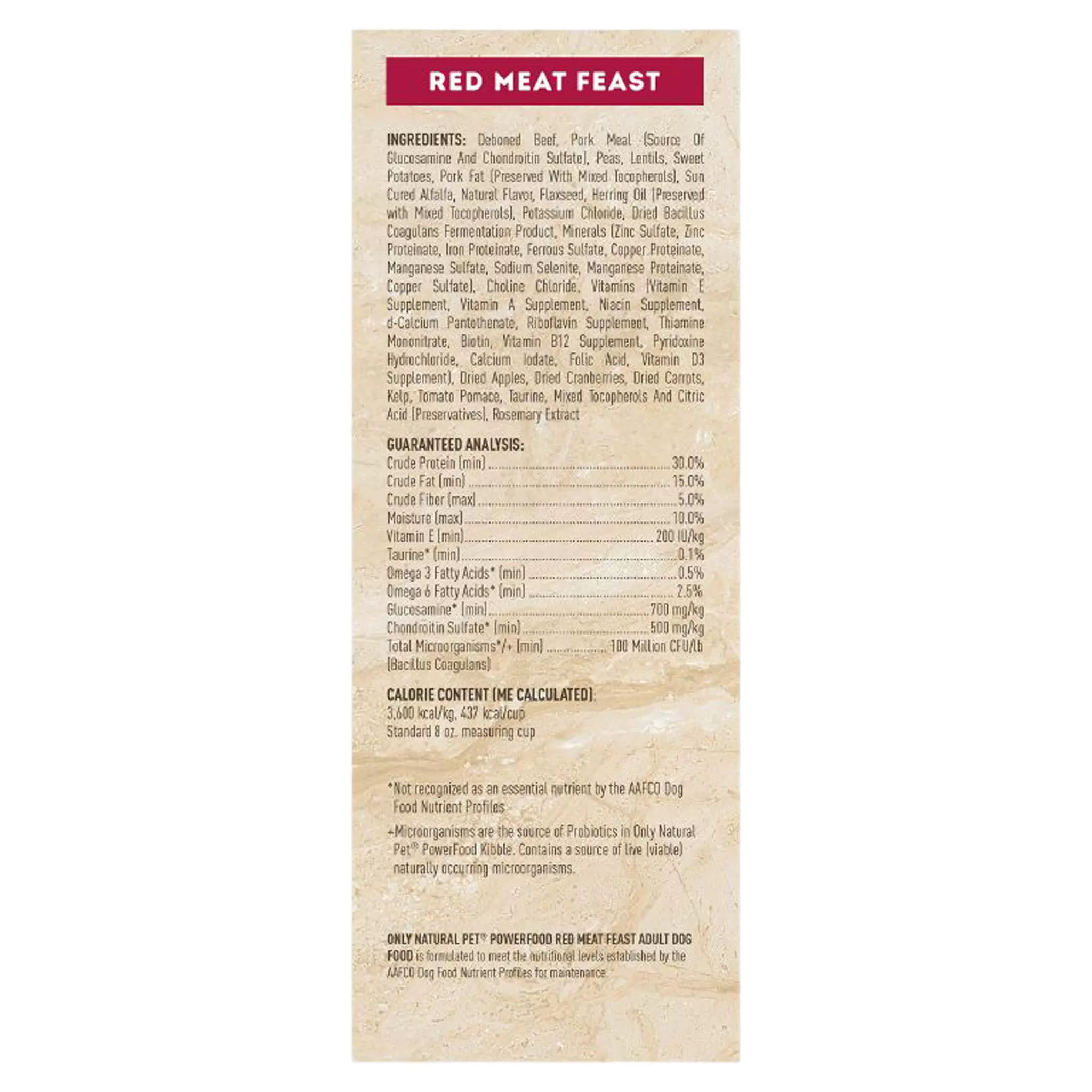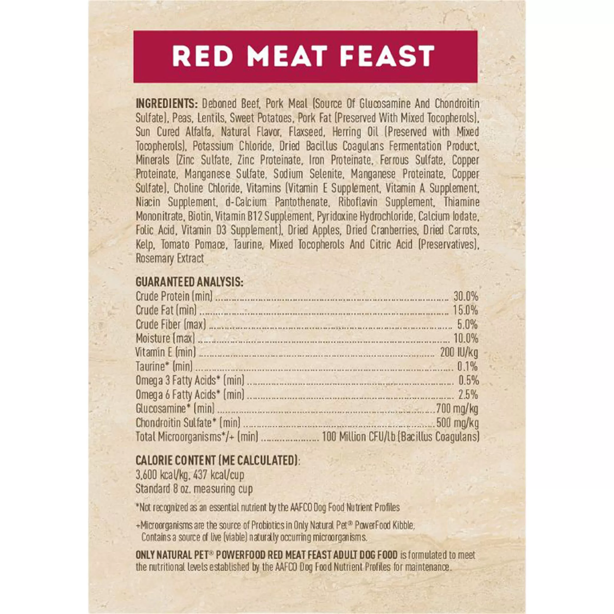 Only Natural Pet PowerFood Red Meat Feast Dog Food is a dry dog food made with beef, pork meal, real vegetables, & fruit. These ingredients combine for a nutritious meal that features 30% protein and is complete and balanced for adult dogs.