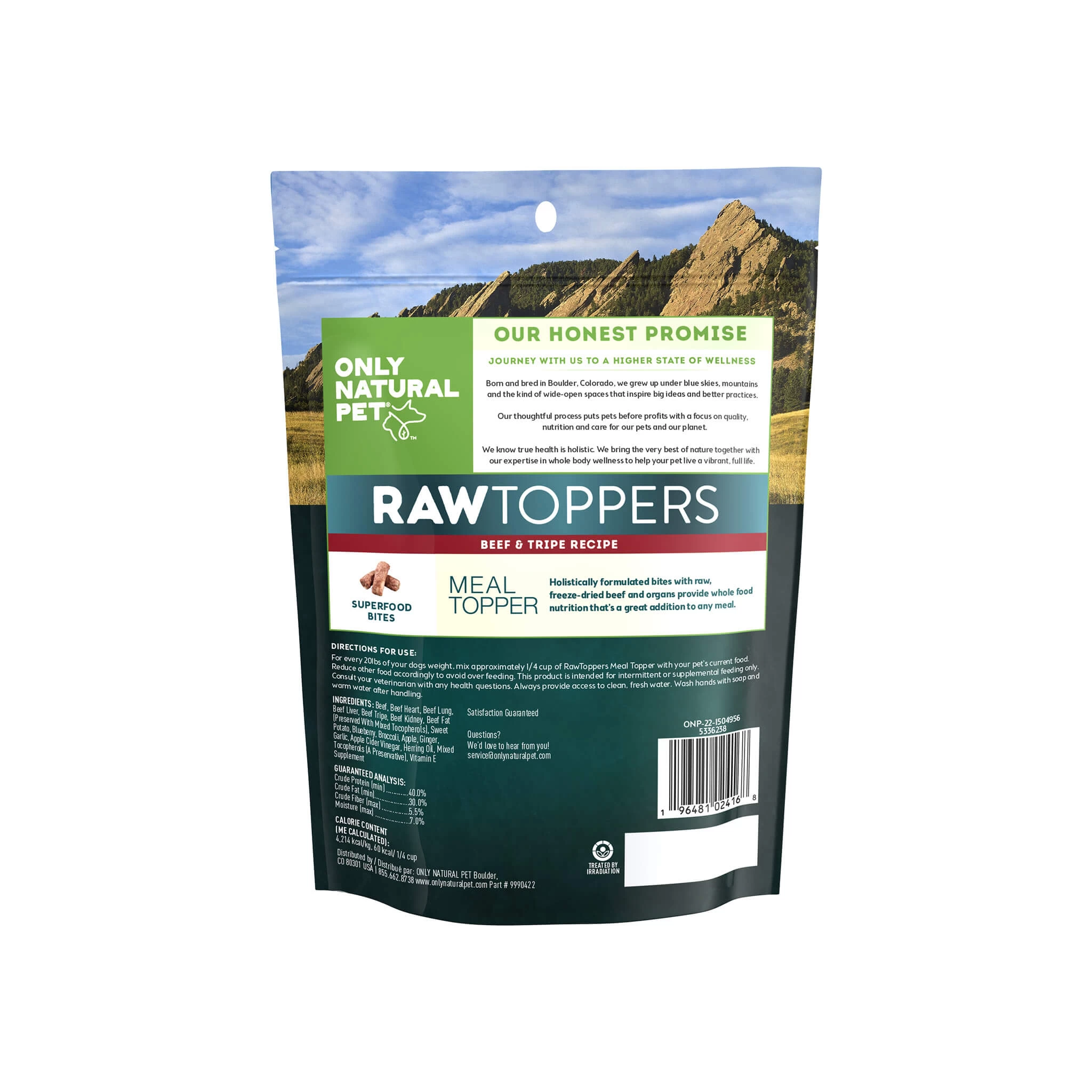 Discover the added taste and nutrition that Only Natural Pet Raw Toppers Freeze-Dried Beef & Tripe Recipe Meal Topper for Dogs can offer today!