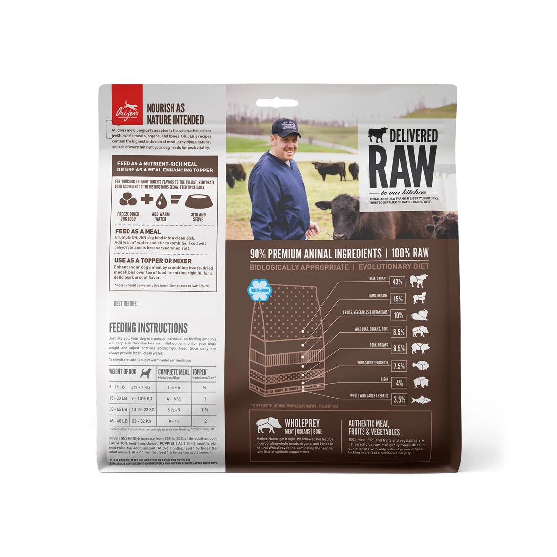 All of the ingredients in Orijen Grain-Free Freeze-Dried Dog Food meals are regionally raised and delivered fresh to the Orijen facility. This ensures that the gentle freeze drying process seals in the freshness, quality, and benefits your dog would receive from a raw diet. Feed as a complete meat, or highly nutritious topper!