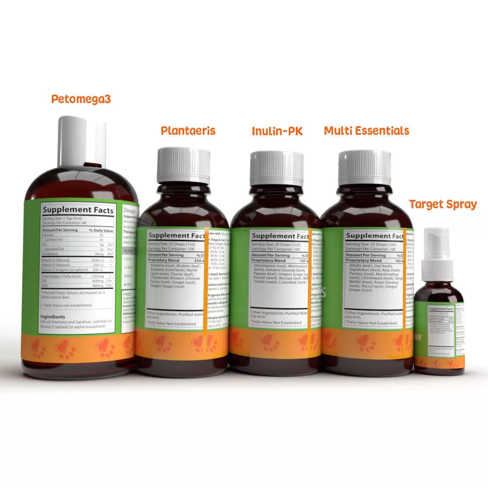 Puppies and kittens have very sensitive GI tracts, and they love to lick, gobble and chew on things that they aren’t supposed to (like poop), so they are prone to having worm or parasite infections, and upset tummies. Ingredients like elecampane, celandine, milk thistle, and wormwood in Inulin-PK are very gentle aids that encourage the healthy elimination of worms and parasites while helping to maintain a healthy gut. Multi Essentials helps your pet get extra vital nutrients and minerals, which may improve nutrient absorption and metabolism, leading to increases in energy levels and overall vitality. In Petomega 3, the EPA and DHA omega 3s provide critical building blocks for healthy skin development in the coat, eye, heart, and brain, as well as support healthy immune response. Plantaeris contains herbs like thyme which promotes digestion by relaxing muscle cramping and Mullein soothes and lubricates delicate intestinal mucosa while providing gentle support for diarrhea. Ingredients like neem, aloe vera, and tea tree oil in the First Aid Spray contain natural disinfectant properties for cleaning wounds and preventing infection, and the sedative properties of California poppy help reduce stress to encourage faster healing.