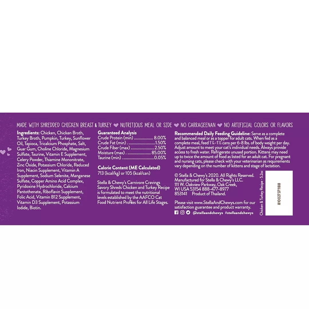Stella and Chewy’s Carnivore Cravings Savory Shreds Chicken and Turkey Wet Cat Food is a shredded chicken and turkey cat food with bits of pumpkin in a tasty turkey broth. Rich in animal protein and low in carbs with added taurine to support heart health, this wet cat food provides essential moisture to keep your cat hydrated.