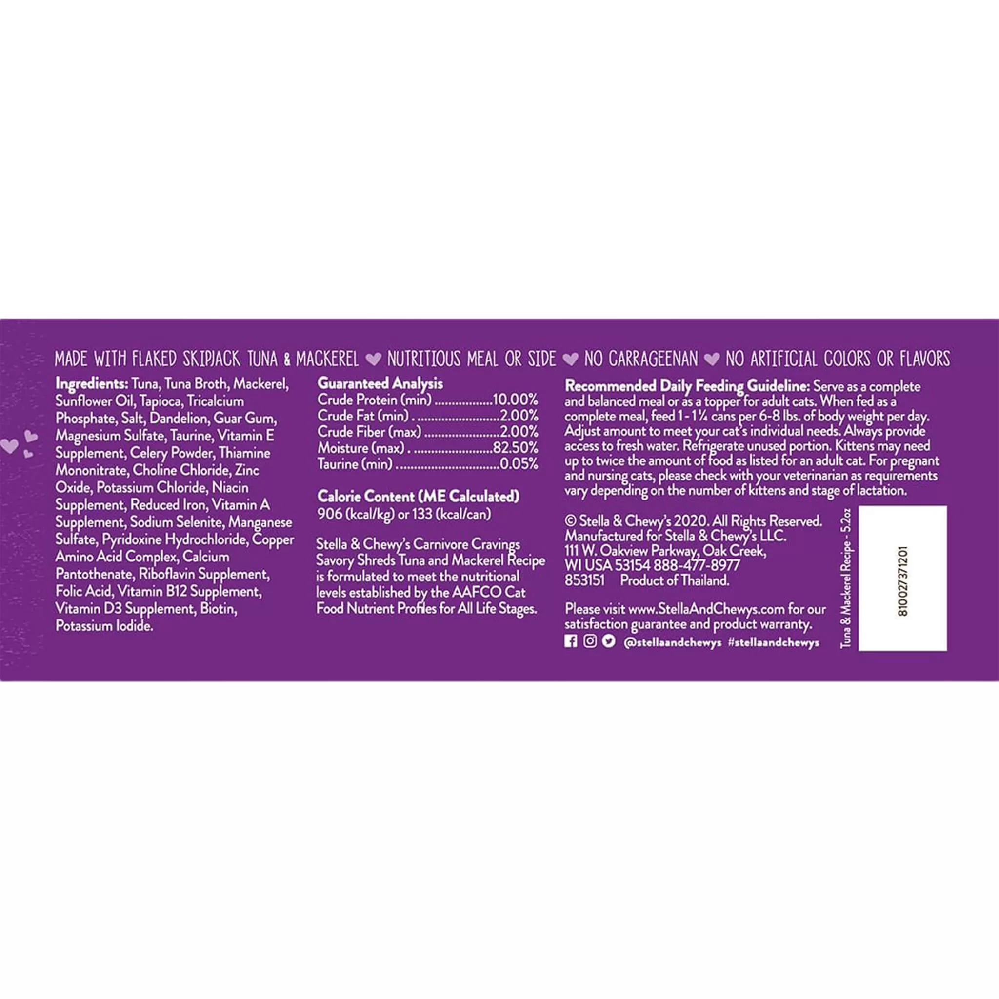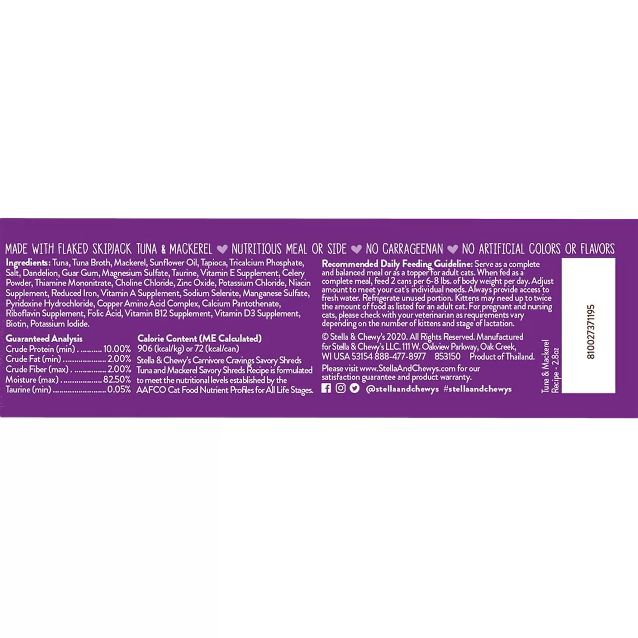 Stella and Chewy’s Carnivore Cravings Savory Shreds Tuna and Mackerel Wet Cat Food is made from responsibly sourced, wild-caught tuna and mackerel and there are never any added hormones or antibiotics. Your cat is sure to love the texture as it is made from real shredded muscle meat.