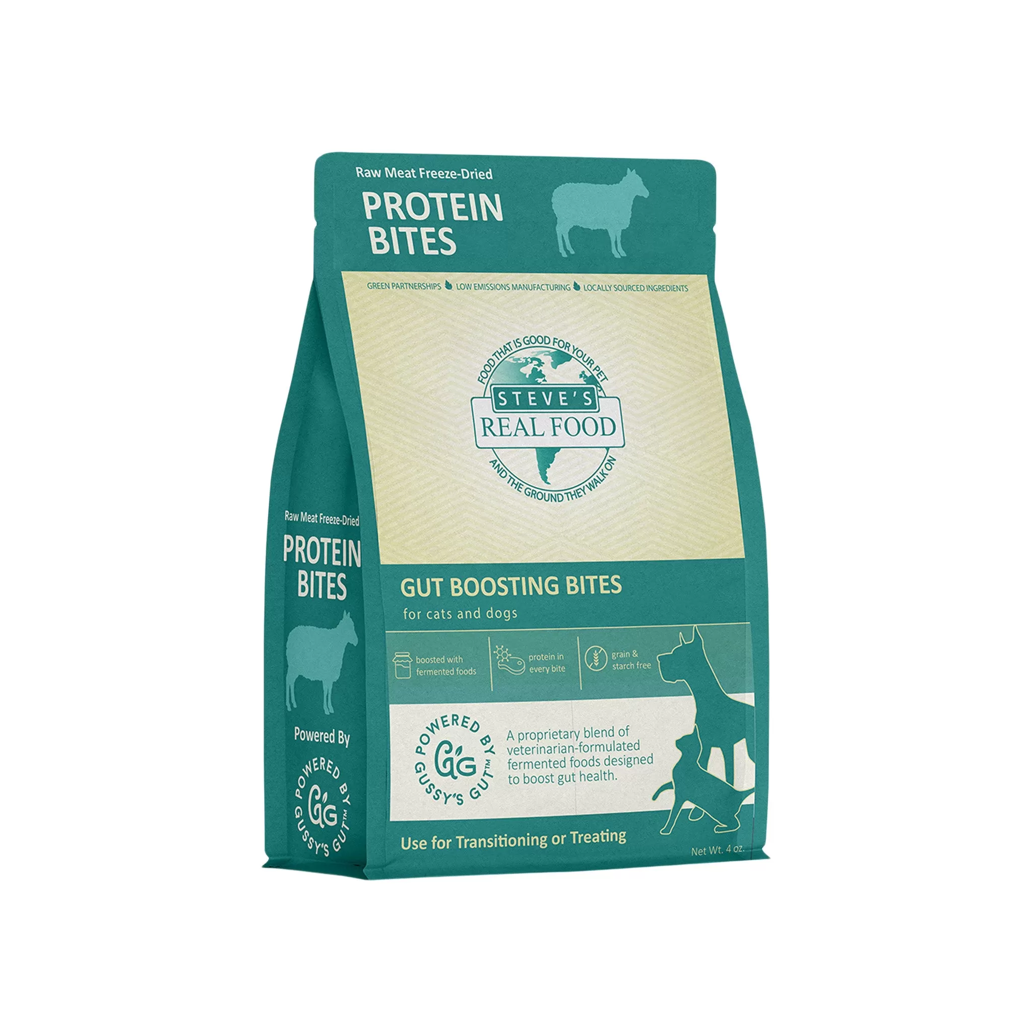 Steve’s Real Food Probiotic Protein Bites are a great treat for both dogs and cats. These freeze-dried treats are powered by Gussy’s Gut organic fermented superfood blend, coconut oil, and locally-sourced raw honey. Protein Bites are a healthy and delicious way to add whole living foods to your pet’s diet.