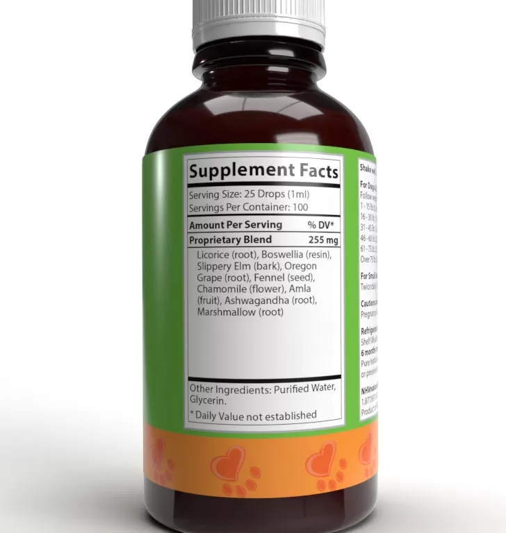 TumFlora is a natural herbal vet formulation designed to help improve intestinal flora. In addition to helping improve intestinal flora, and helping with inflammation of the digestive tract, TumFlora contains herbs that are highly nutritious like slippery elm to further help your furbaby heal. Slippery elm is high in vitamins and minerals such as vitamin A, B complex, C, K, calcium, magnesium and sodium. The gentle defense against microorganisms and anti-fungal properties of herbs like oregon grape aid the body to fight off infections. Finally, herbs like fennel and chamomile help to relieve stomach cramps and indigestion and help with overall discomfort.