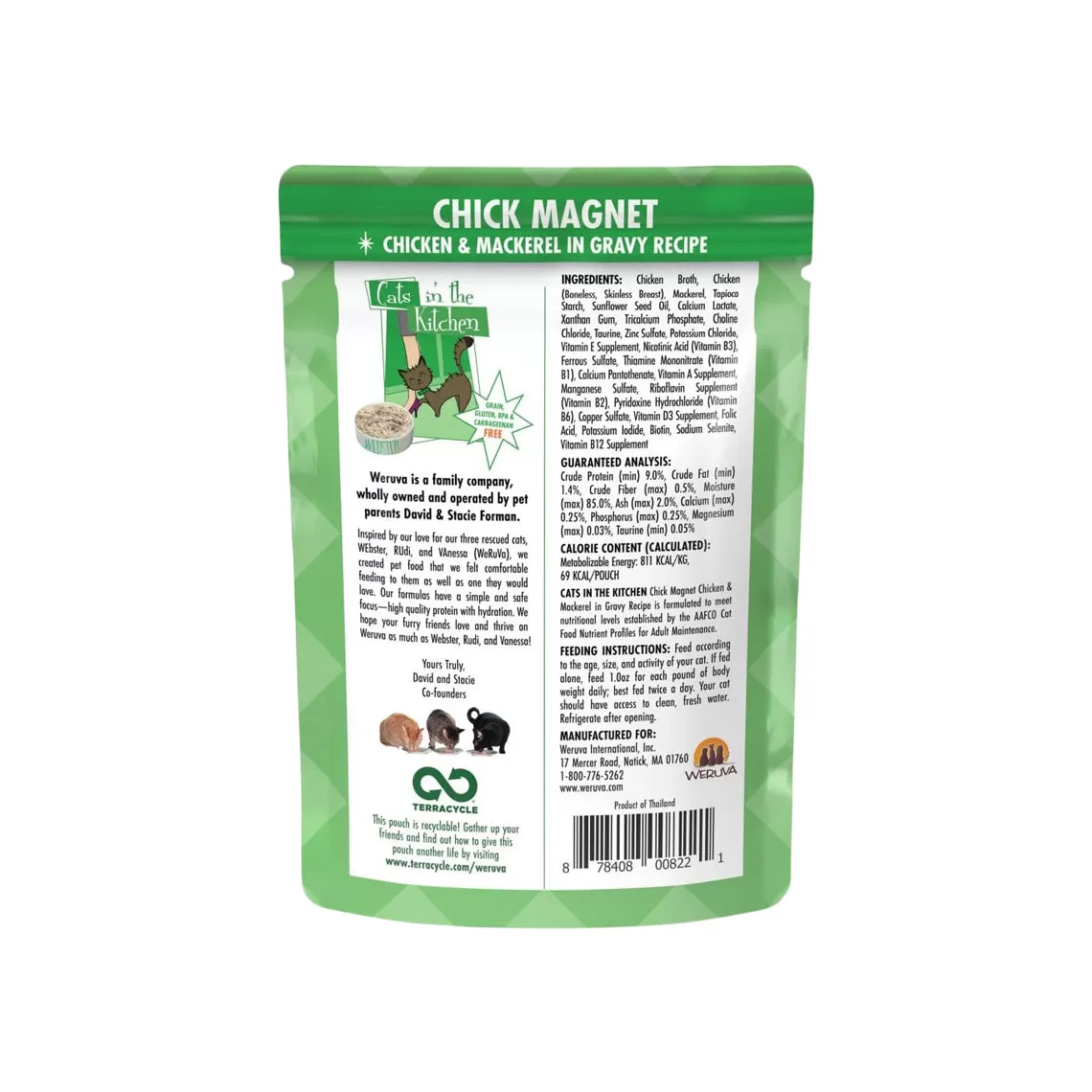 Weruva Chick Magnet Pouches feature free range Chicken in savory gravy. Completely grain and gluten free, this highly palatable formula features Vitamins B and K and is perfect for your obligate carnivore. These easy-to-open pouches seal in the food’s moisture, which is your cat’s primary source of hydration; they’re also BPA free. Open a pouch and let your cat enjoy Weruva Chick Magnet.