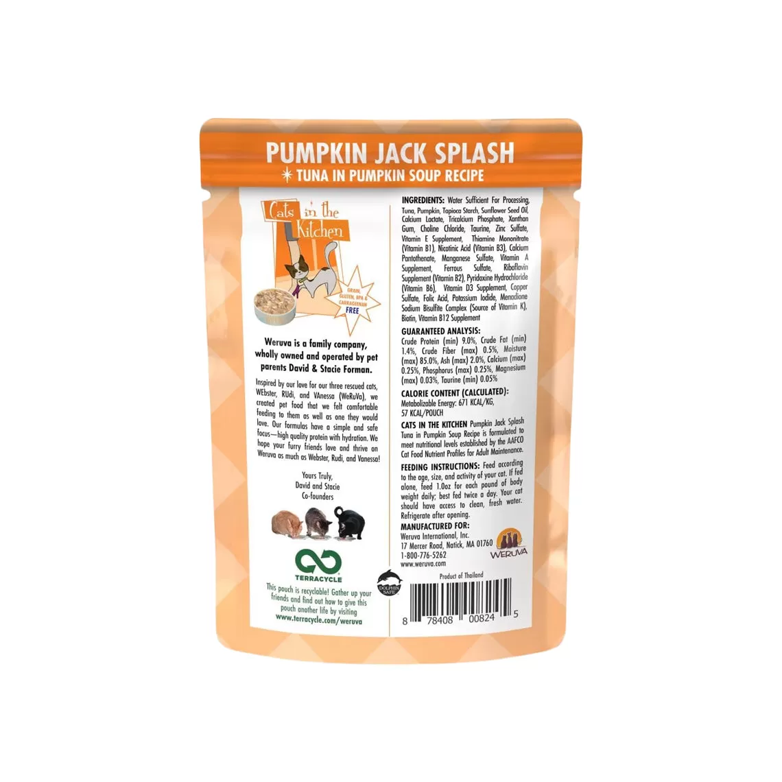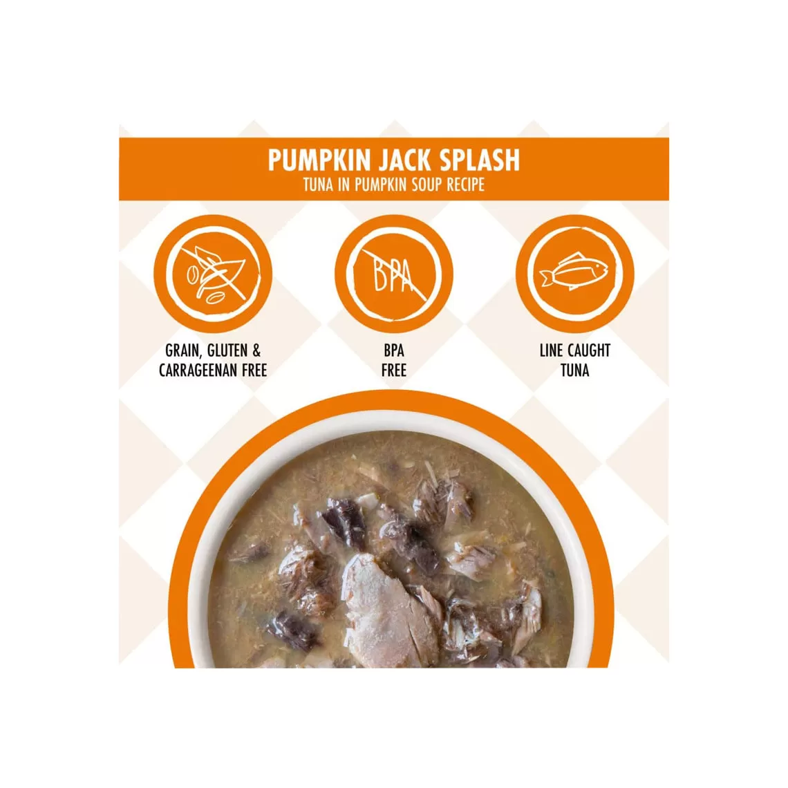 Weruva Pumpkin Jack Splash Pouches feature wild caught, dolphin safe Tuna in a Pumpkin soup recipe. Completely grain and gluten free, this highly palatable formula features Vitamins B and K and is perfect for your obligate carnivore. These easy-to-open pouches seal in the food’s moisture, which is your cat’s primary source of hydration; they’re also BPA free. Open a pouch and let your cat enjoy Pumpkin Jack Splash.